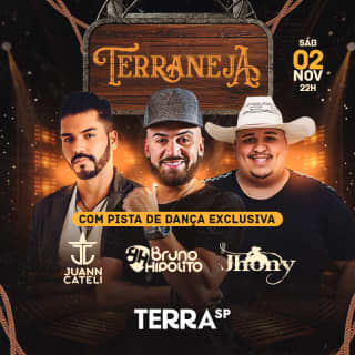 Show Terraneja com Bruno Hipólito, Juann Cateli e Jhony Quadros ⭐ A balada sertaneja mais querida de todos os tempos está confirmada para este sábado! Venha fazer parte da melhor festa de dança com muito do Sertanejo: Bruno Hipólito, Juann Catelli e Jhony Quadros em uma só noite no Terra SP. Bora?! 😍