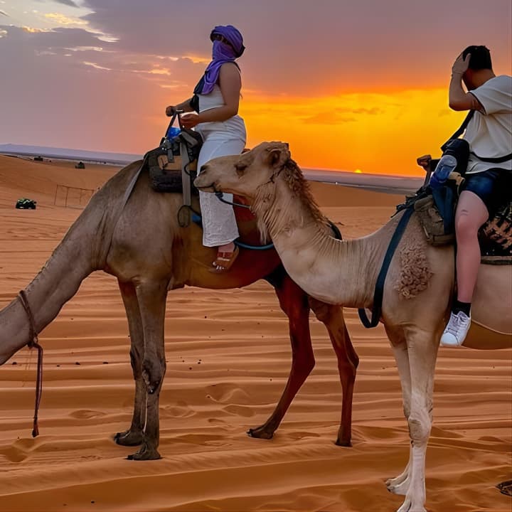 🌅 Assiste au coucher du soleil sur les dunes de sable doré de l'Erg Chebbi au cours d'une randonnée magique à dos de chameau.