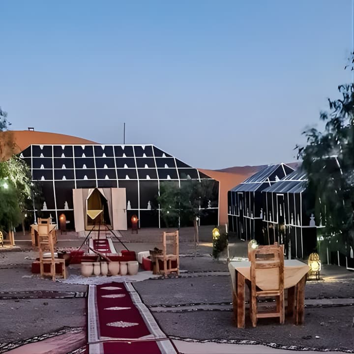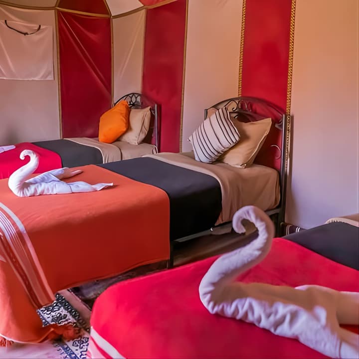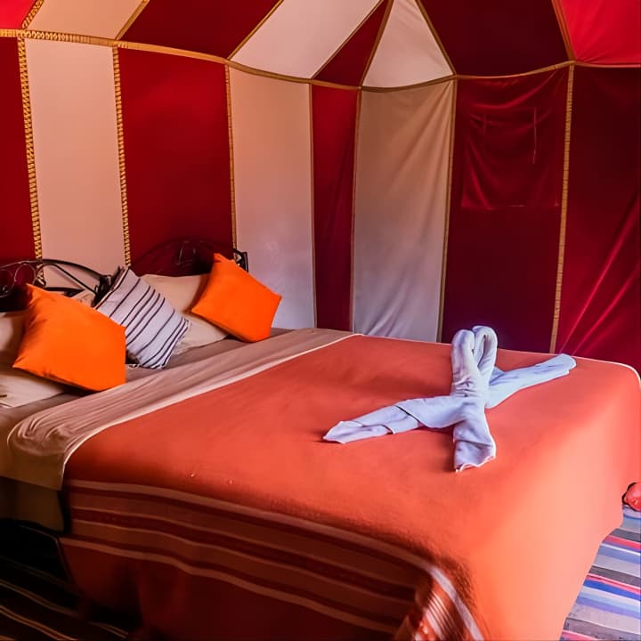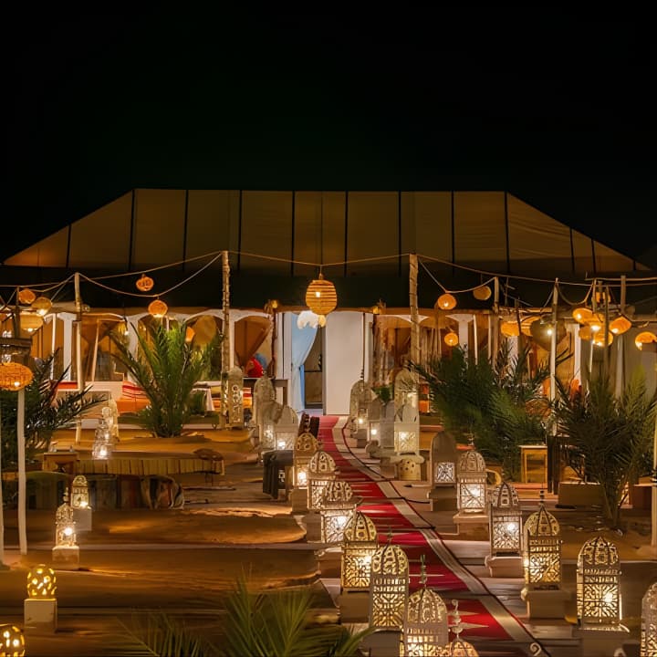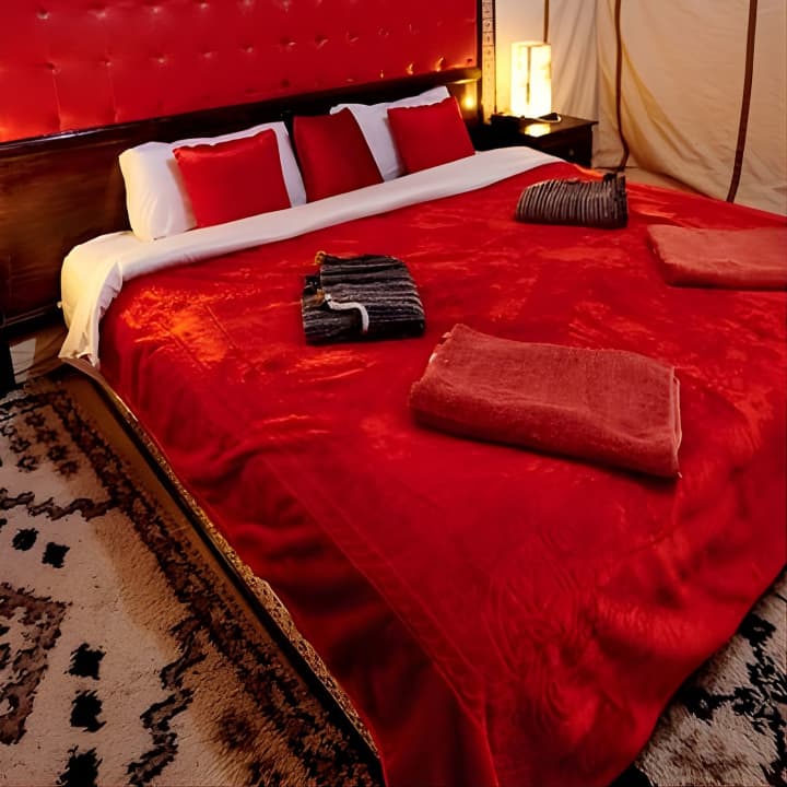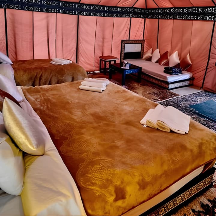 🏕️ Séjourne dans un camp de luxe avec une tente privée et une salle de bain attenante au cœur du désert.