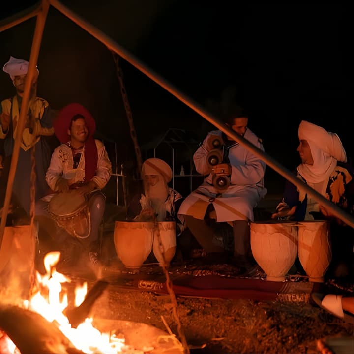 🎶 Profite d'un délicieux dîner et de la musique traditionnelle des tambours berbères sous un ciel étoilé dans le désert.