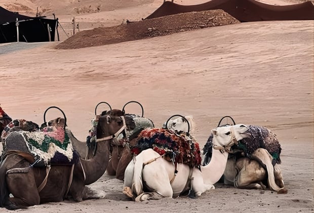 Coucher de soleil & Dîner dans le désert Agafay Marrakech avec les chameaux