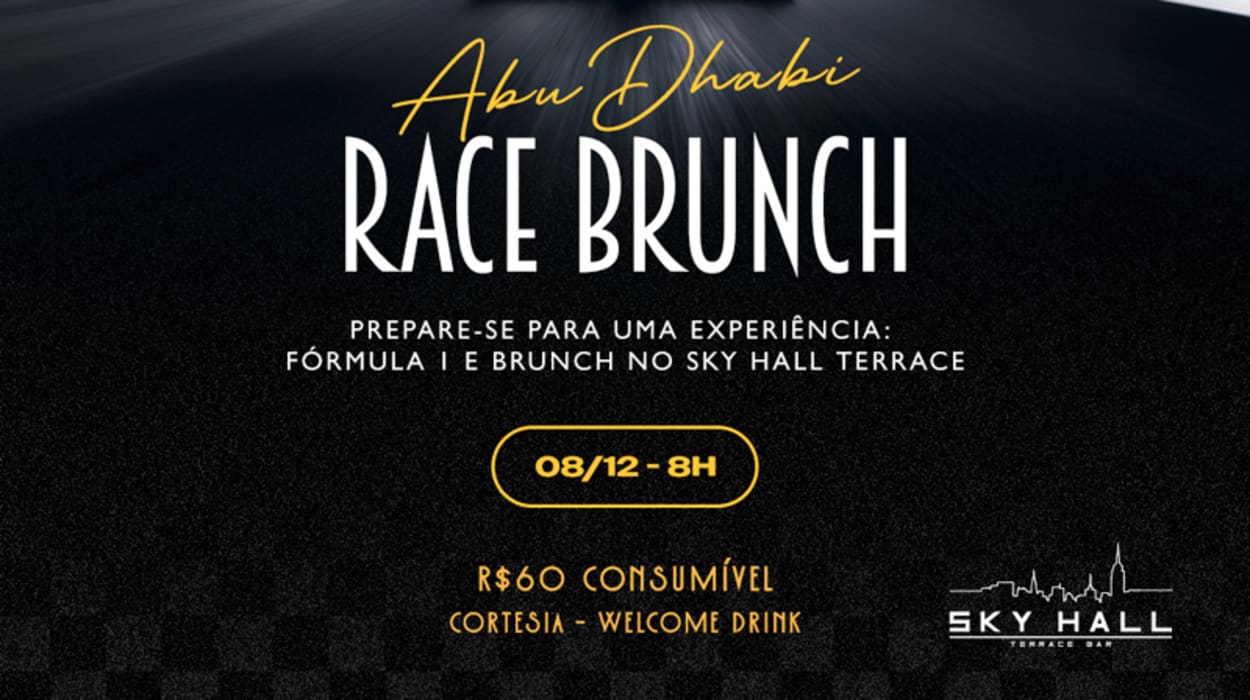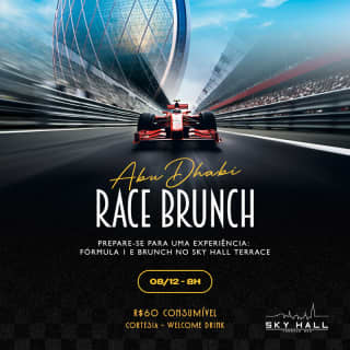 Venha viver uma experiência no Race Brunch do Sky Hall Terrace! Venha assistir à corrida de Fórmula 1 ao vivo em nossa casa. Por apenas R$60 consumíveis, você aproveita um brunch exclusivo com direito a um welcome drink (taça de espumante). Este evento foi feito para os apaixonados por velocidade e um brunch de primeira. Compre seu ingresso e não perca essa experiência no Sky Hall Terrace, em São Paulo!