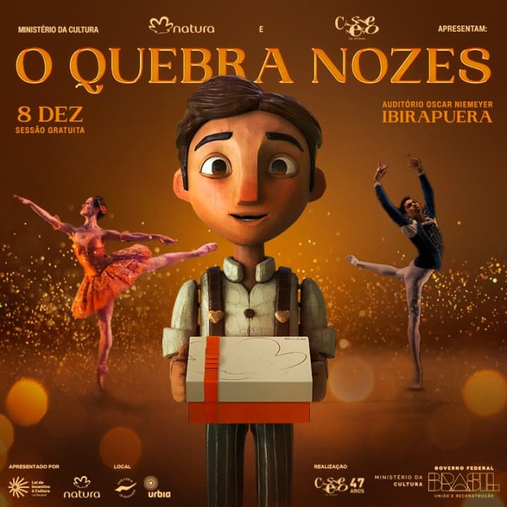 O Auditório do Parque Ibirapuera celebra a magia do Natal apresentando o espetáculo O Quebra Nozes pelo segundo ano consecutivo. Curta a história de Clara, uma menina que, na noite de Natal, recebe vários presentes, mas se encanta especialmente por um boneco quebra-nozes, presente de seu tio. Ao adormecer, Clara sonha com um mundo mágico, onde brinquedos ganham vida, dançam e lutam batalhas épicas. Contando com grande elenco, nesta temporada, os solistas convidados, provenientes de renomadas companhias da Alemanha são: Aurora Dickie , Solista do Staatsballett Berlin e Rafael Vedra, Solista do Ballett am Rhein, Düsseldorf , enriquecendo ainda mais a experiência. Além deles, o ator Felipe Carvalhido retorna ao papel de Drosselmeyer, tio enigmático de Clara, completando 17 anos no papel. O Circo Escola Picadeiro fica responsável pelos efeitos especiais, e os espectadores serão surpreendidos por novos cenários, cuidadosamente elaborados para intensificar a imersão e o encantamento da narrativa sob a direção artística de Dany Bittencourt.