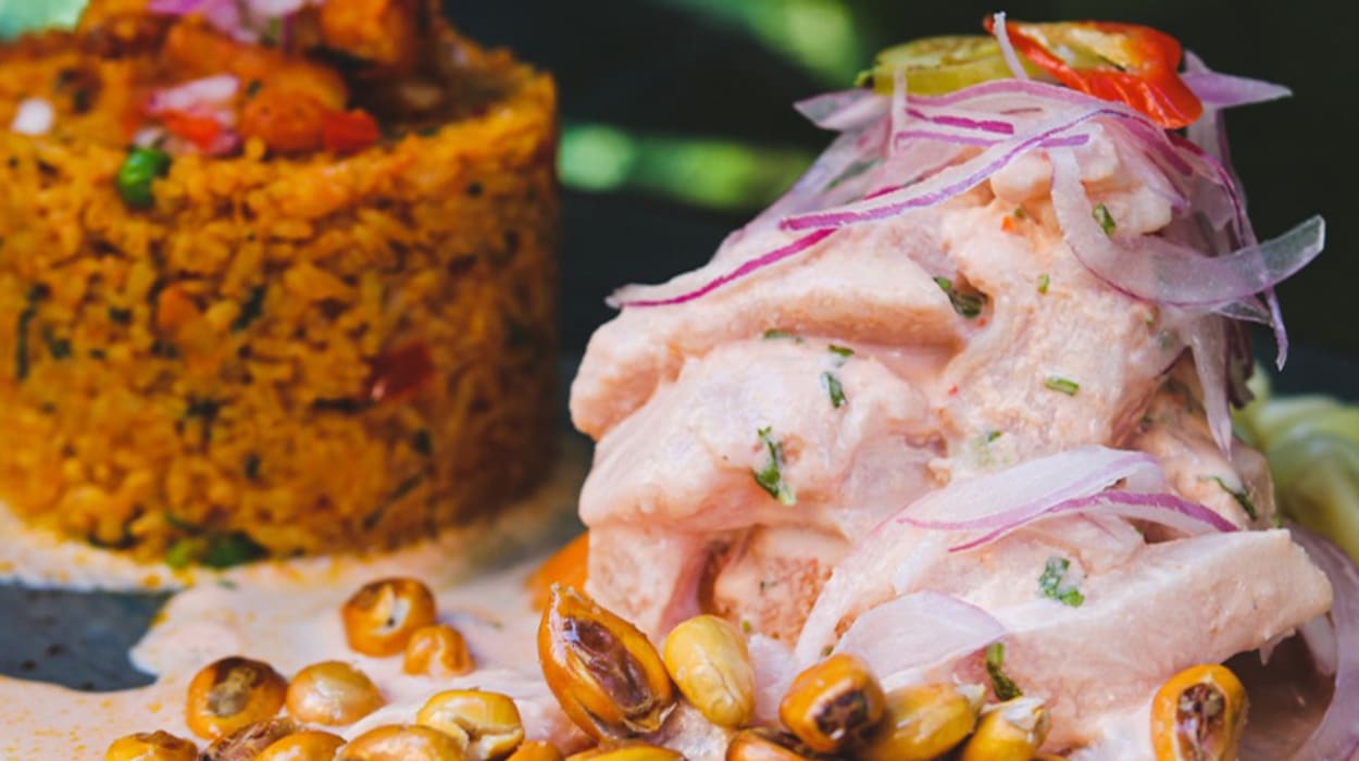 🐟 Ceviche de pescado: Marinado en leche de tigre, acompañado de choclo, cancha y camote