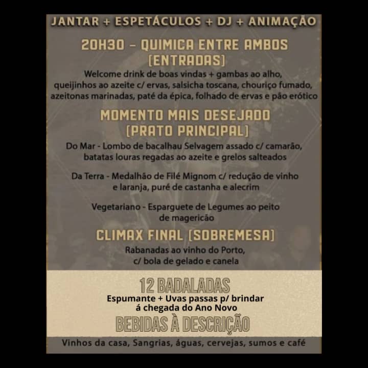 Inclui jantar completo, animação e uma festa fora da caixa de tudo o que já viveste.