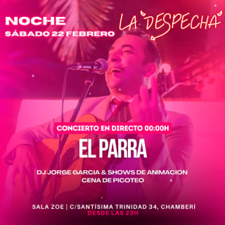 La Despechá Saturday Night es mucho más que una fiesta, es el epicentro de las noches madrileñas en Ponzano. Disfruta de un concierto en directo con "El Parra 2", acompañado de los mejores DJ’s y una animación que te mantendrá bailando hasta el amanecer. Juegos, sorpresas y un ambiente vibrante completan esta experiencia que no puedes perderte. Ven a la Sala Zoe y vive una noche mágica llena de energía y diversión.