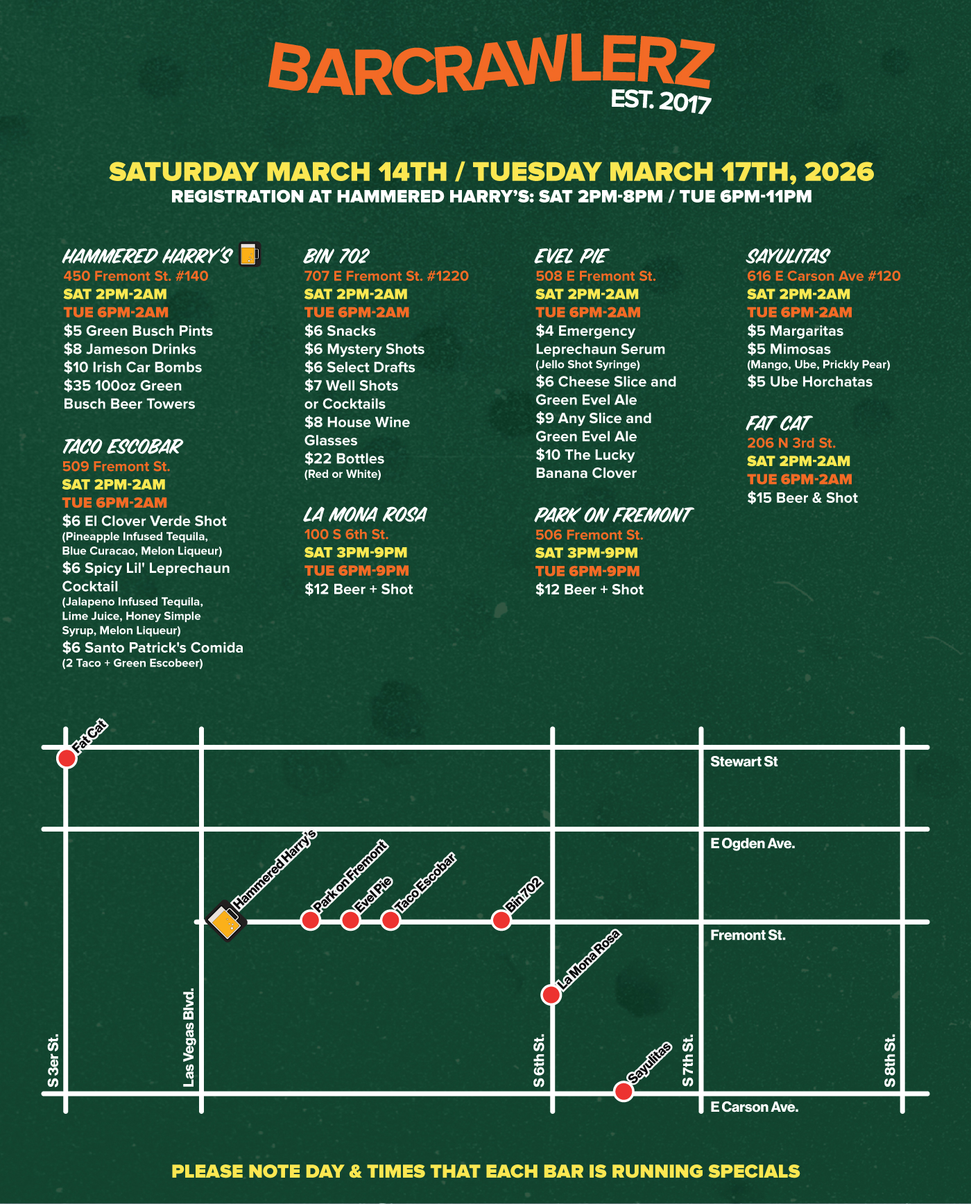 2) Check in at Hammered Harry's (450 Fremont St #140) to get your wristband and map with participating bars, their location, and their drink specials. (Registration on Saturday, 3/14 from 2PM-8PM & Tuesday, 3/17 from 6PM-11PM) ***WRISTBAND MUST BE PICKED UP DURING THESE TIMES***