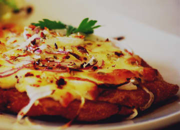 - Pizza con base de pollo, queso, mozzarella y cebolla
