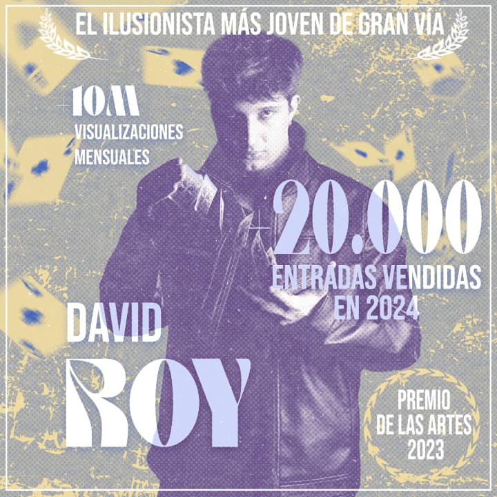 David Roy is the youngest magician on the Gran Via and, thanks to his talent, he has been awarded the 2023 Arts Award. In his magic, humor and improvisation show, David mixes amazing tricks with a large dose of comedy, creating an unforgettable show for all audiences. He is famous for having conquered Risto Mejide in Got Talent Spain, and now you can enjoy his magic live, after the success of his tour in Spain and sold out in Gran Via. Do not miss the opportunity to experience this unique show!