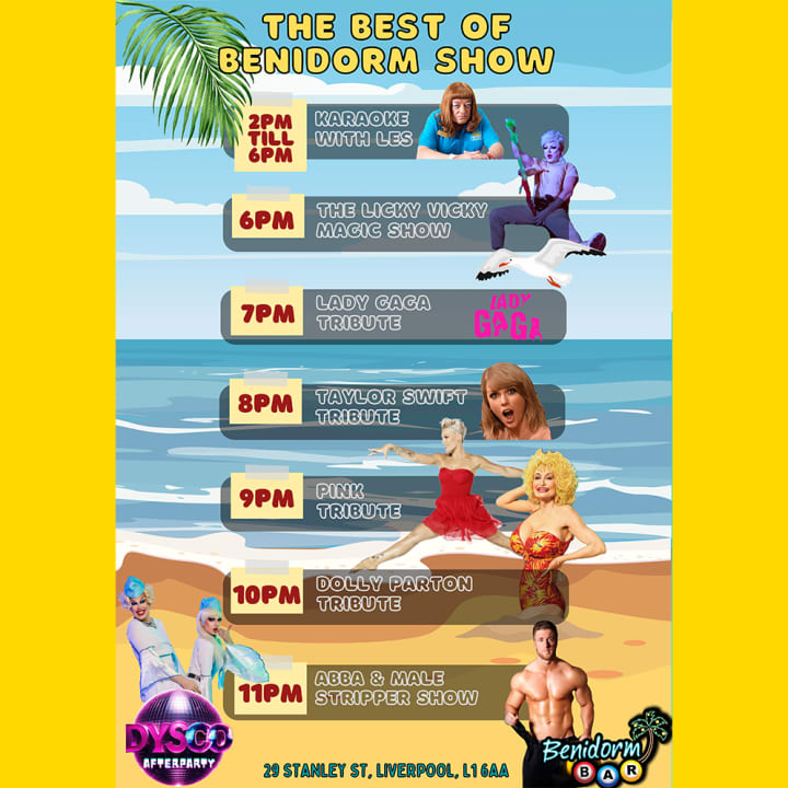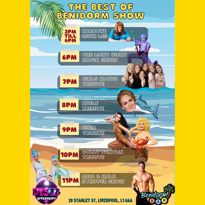 ⭐ Experience the wild energy of Benidorm right in Liverpool! Every Saturday, we bring you an electrifying lineup of tribute acts, karaoke, magic shows, drag queens, and strippers!