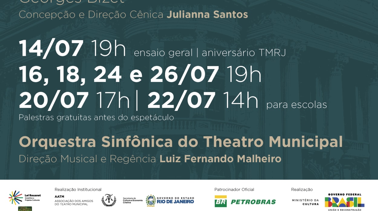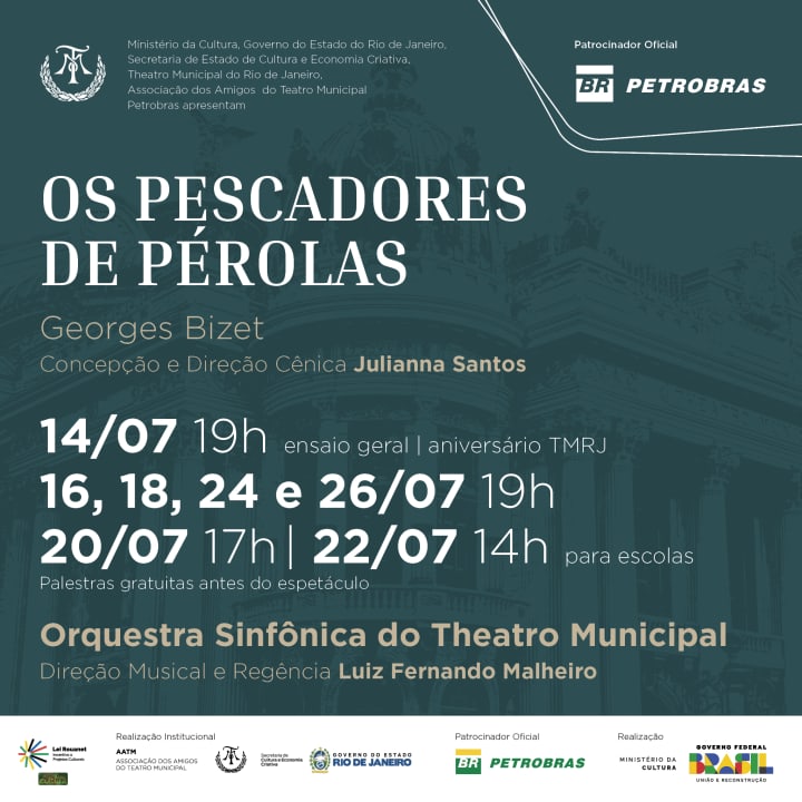 Os Pescadores de Pérolas, a linda ópera de Georges Bizet, o autor da célebre ‘Carmen’, passa-se no Ceilão e conta a história de dois grandes amigos, Nadir e Zurga, que disputam o amor da bela Leila. Com Orquestra e Coro do Theatro Municipal, solistas convidados sob a regência de Luiz Fernando Malheiro e Direção Cênica de Julianna Santos.