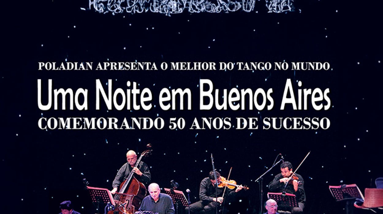 Assistido por mais de 5 milhões de espectadores no mundo, chega ao Brasil, para comemorar 50 anos de sucesso, o maior espetáculo de Tango do mundo, Uma Noite em Buenos Aires. Será apenas 1 apresentação no Rio de Janeiro no Theatro Municipal do Rio de Janeiro, dia 31 de Maio Produzido e dirigido por Manoel Poladian e Carlos Buono, o espetáculo reúne grande estrelas do Tango Argentino, como o Maestro Carlos Buono, prêmio Bandoneon de Ouro, que já encantou milhares com seus shows e participações em espetáculos de grandes Orquestras como Sinfônica Stravinsky de Moscou e a Opera de Roma, o Noneto Buoníssimo, formado por virtuosos maestros que tocam nas grandes casas de Tango de Buenos Aires e ainda os cantores Alberto Bianco, voz de destaque divulgando o Tango pelo mundo e Claudia Pannone , cantora do projeto "Gotham Project" que inovou e aproximou o Tango das novas gerações. O espetáculo traz ainda 2 casais campeões mundiais de tango Ivan Romero e Silvana Nuñes e Federico Paleo e Luciana Franchelli. Um espetáculo imperdível para os amantes do Tango Argentino!