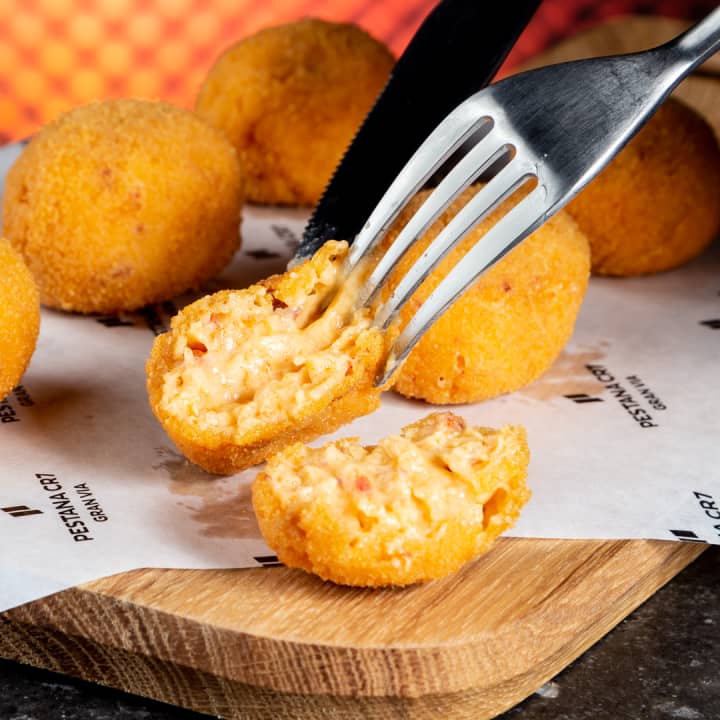 En la Planta 9 del Pestana CR7 Gran Vía disfrutarás de un menú gourmet con una selección de platos de alta calidad, como el Provolone, Croquetas de jamón ibérico, Rigattone Carbonara o Pizza especialidad-Trufadela o Pizza Margarita. Todo esto acompañado de las mejores vistas de Madrid y un ambiente único en la azotea más exclusiva de la Gran Vía. ¡Una experiencia única para compartir con alguien especial!