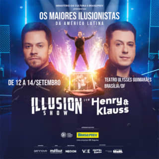 Henry & Klauss, os maiores ilusionistas da América Latina, retornam a Brasília para uma temporada única e exclusiva no Teatro do Centro de Convenções Ulysses Guimarães. Conhecidos por suas performances que misturam ilusionismo moderno, efeitos visuais de última geração, números que desafiam a lógica. O "Illusion Show", é apresentado pelo Ministério da Cultura e Brasilprev, realizado por Henry & Klauss e VME. Desta vez, com shows recheados de música, dança, e claro: ilusionismo. Renomados mundialmente, os mestres da mágica estão prontos para mostrar ao público a habilidade única de surpreender e encantar. Com uma trajetória consagrada em diversos países, Henry & Klauss são amplamente reconhecidos por suas inovações no ilusionismo. Para esta temporada, eles prepararam uma performance ainda mais surpreendente, com números inéditos e trilha sonora 100% original que acompanha o espetáculo, criando uma imersão total para o público. A temporada de 2025 é apresentada pelo Ministério da Cultura e Brasilprev, que apostam na valorização da arte de ilusionismo como forma de promover cultura e entretenimento de qualidade no país. Claro que a censura é livre para ver os melhores ilusionistas da América Latina, Henry e Klauss.