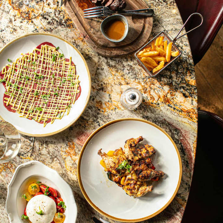 🥩 Mains include Baby Chicken, Flat Iron Steak, Seabass Fillet, or Primavera Risotto