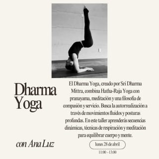 El Dharma Yoga, creado por Sri Dharma Mittra, combina Hatha-Raja Yoga con pranayama y meditación, buscando la autorrealización a través de movimientos fluidos y posturas profundas. Durante este taller, aprenderás secuencias dinámicas y técnicas de respiración que equilibrarán tu cuerpo y mente. Ana Luz, profesora con más de 15 años de experiencia, compartirá contigo su conocimiento profundo de esta disciplina y su formación directa con grandes referentes del Yoga. Un espacio perfecto para quienes buscan equilibrio, autoconocimiento y conexión con su ser interior.