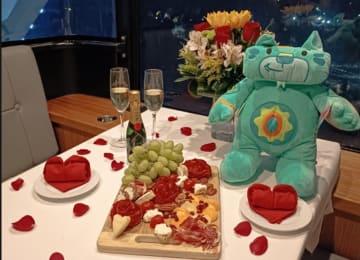 - 1 special Valentine’s Day board with cold cuts, cheeses, dried fruits, fine seeds, grapes, strawberries, and apple.