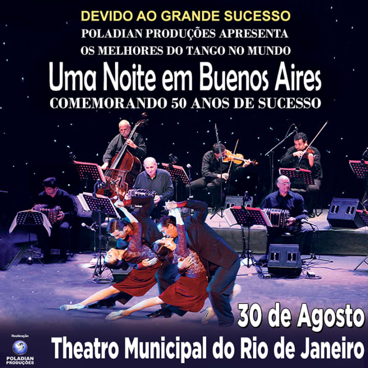 Assistido por mais de 5 milhões de espectadores no mundo, chega ao Brasil, para comemorar 50 anos de sucesso, o maior espetáculo de Tango do mundo, Uma Noite em Buenos Aires. Será apenas 1 apresentação no Rio de Janeiro no Theatro Municipal do Rio de Janeiro, dia 31 de Maio Produzido e dirigido por Manoel Poladian e Carlos Buono, o espetáculo reúne grande estrelas do Tango Argentino, como o Maestro Carlos Buono, prêmio Bandoneon de Ouro, que já encantou milhares com seus shows e participações em espetáculos de grandes Orquestras como Sinfônica Stravinsky de Moscou e a Opera de Roma, o Noneto Buoníssimo, formado por virtuosos maestros que tocam nas grandes casas de Tango de Buenos Aires e ainda os cantores Alberto Bianco, voz de destaque divulgando o Tango pelo mundo e Claudia Pannone , cantora do projeto "Gotham Project" que inovou e aproximou o Tango das novas gerações. O espetáculo traz ainda 2 casais campeões mundiais de tango Ivan Romero e Silvana Nuñes e Federico Paleo e Luciana Franchelli.
