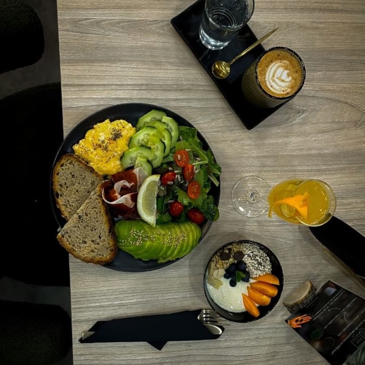 - Accompanied by your favorite coffee/tea (inclye espresso, long black or latte) or aromatic tea. You can choose flat white, espresso tonic (espresso orange for 1-2€ more depending on the beverage)