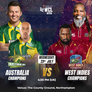 Welcome to WCL 2025 – The Champions World Cup, where history is rewritten one over at a time. This premier international legends T20 tournament reunites the most iconic cricketers from across the globe, officially backed by the England & Wales Cricket Board and broadcast in over 100 countries. Following a record-shattering debut in 2024, WCL now returns with a vengeance, expanding across four iconic UK venues and taking global audiences by storm. From Gayle’s sixes to Yuvraj’s fire, Afridi’s charisma to AB de Villiers' finesse, WCL blends the glory of the past with the thrill of today. Get your tickets for World Championship of Legends (WCL) - Australia Champions vs West Indies Champions now!
