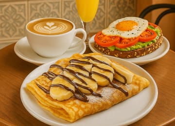 - Menú Delicious: crepe con Nutella y plátano + tostada con aguacate, huevo y tomate + café + zumo