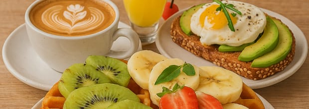 - Menú Waffle: gofre con frutas + tostada con aguacate y huevo + café + zumo