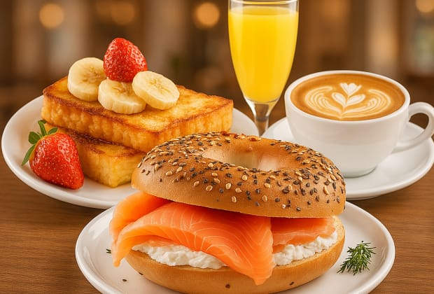 - Menú Parisino: bagel con queso de untar y salmón + 2 tostadas francesas con frutas + café + zumo