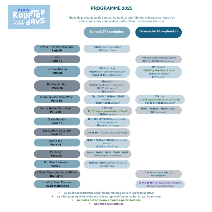 Et si tu redécouvrais Paris… depuis ses toits ? Les Paris Rooftop Days 2025 t’invitent à prendre de la hauteur pour voir la ville autrement. Le thème de l'édition 2025 ? Bouger, s'aérer : pars à la découverte de toits végétalisés ou aménagés, participe à des ateliers créatifs ou sportifs… et profite de vues incroyables sur Paris. Un événement unique, festif et engagé pour célébrer l’innovation urbaine, la nature en ville et des moments inoubliables en altitude. Prends tes places dès maintenant !