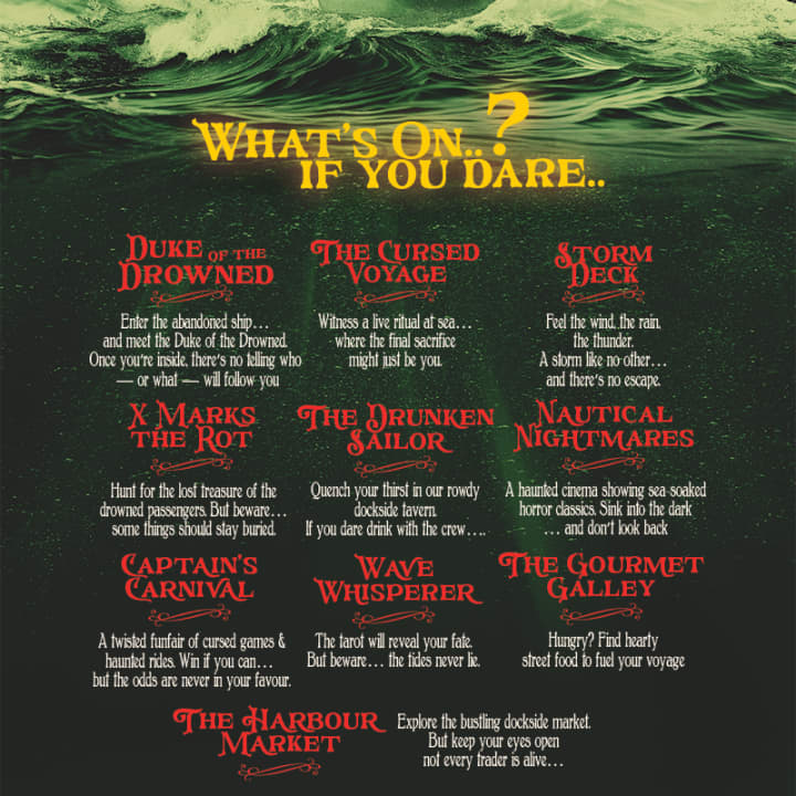 She sailed once⦠but never truly came home. The Duke of Lancaster ship, once the Pride of the Irish Sea, is now a rusting, haunted ship steeped in curses and madness. For 11 nights only, step into Chapter 3: Shipwrecked Survivors, where every deck hides a different horror and every corner drips with Halloween terror. From haunted mazes to eerie bars, twisted rides, and ghostly sailors, this is more than a mazeāitās a full night of immersive Halloween horror.