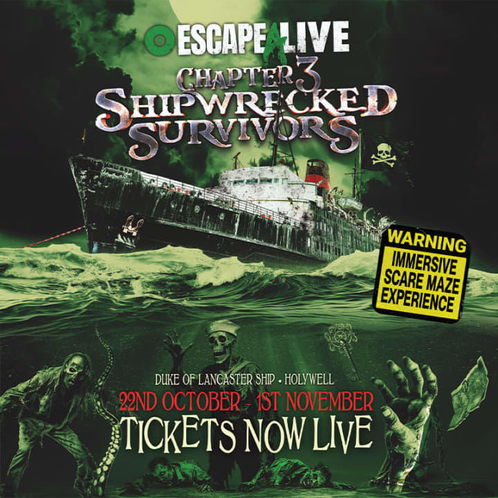⭐ Sube a bordo de Escape Alive: Capítulo 3 - Supervivientes del Naufragio, un aterrador laberinto de miedo de Halloween en el infame Duke of Lancaster en North Wales. ¡Atrévete a revivir las décadas embrujadas de este fantasmagórico barco y experimentar el horror como nunca antes!