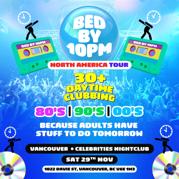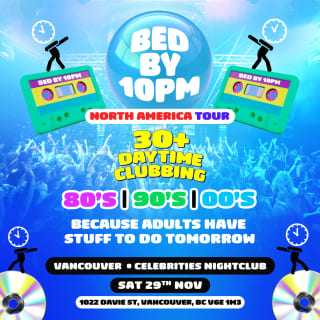 ⭐ Bed By 10pm is coming to Vancouver! The ultimate 30+ clubbing experience is back—dance to the best of the 80s, 90s, and early 2000s while enjoying crazy visuals, CO2 cannons, and a vibrant party atmosphere!