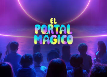 🌈 Un portal neón vibrante crea el ambiente para una presentación mágica y teatral