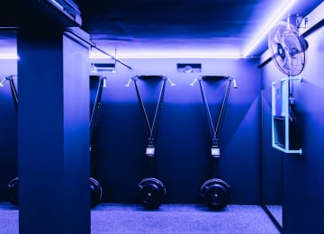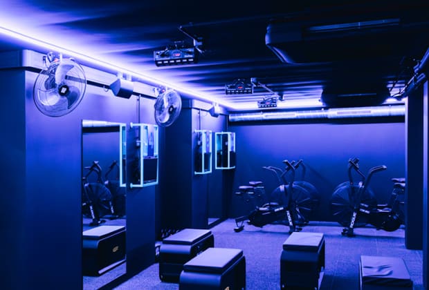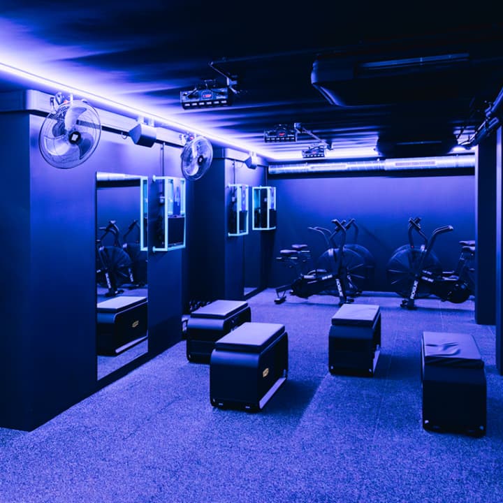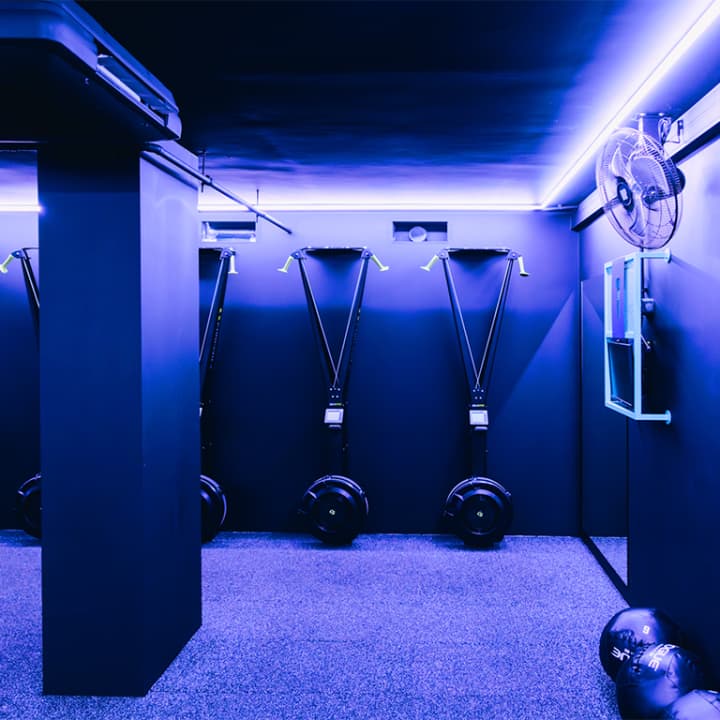 Dans la pénombre, au rythme de playlists exclusives et d’une ambiance lumineuse qui accompagne votre workout complet et intensif.