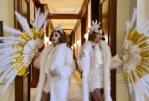 Les artistes, parés de costumes lumineux, accueillent les convives avec charme et élégance. Le voyage commence.