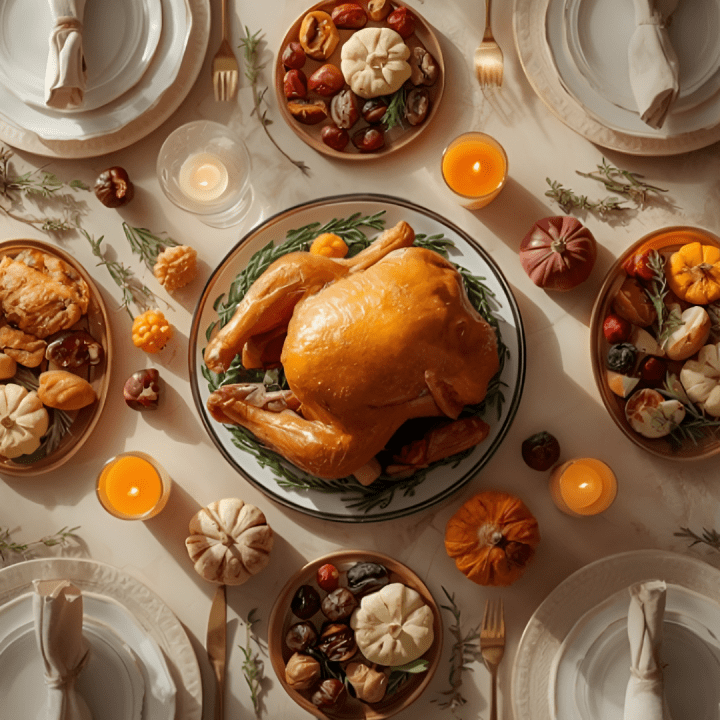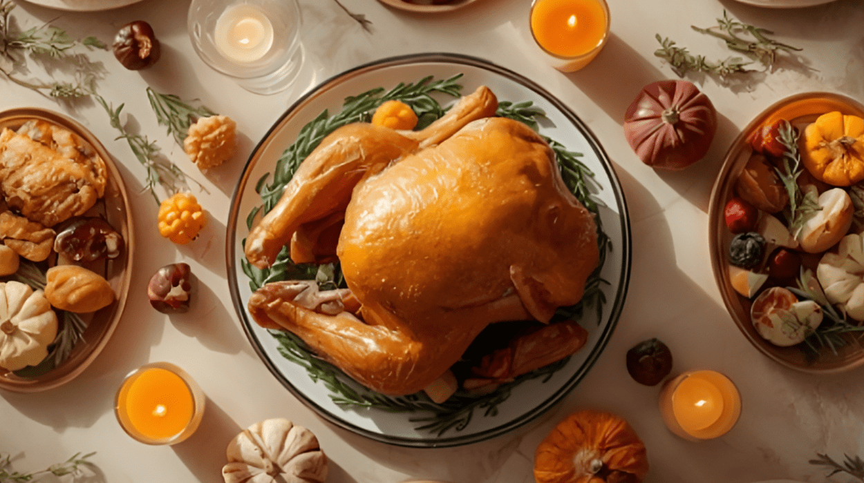 🍗 Pratos clássicos de Ação de Graças, como peru recheado e Beef Brisket ao molho de cranberry