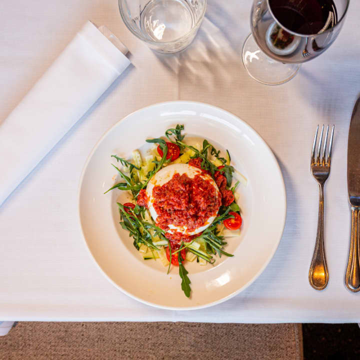 - Burrata con carpaccio de calabacín y pesto rosso