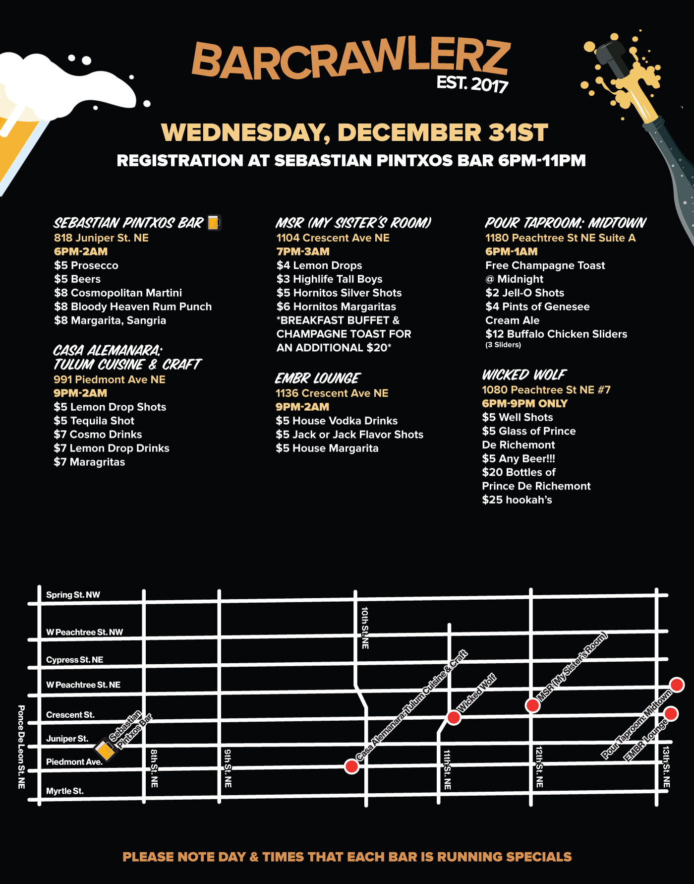 📍 Regístrate en Sebastian Pintxos Bar - (818 Juniper St NE, Atlanta, GA 30308) para obtener tu pulsera y mapa con los bares participantes, sus ubicaciones y sus especiales en bebidas. (El registro es de 6 PM a 11 PM) La pulsera debe recogerse durante este horario.