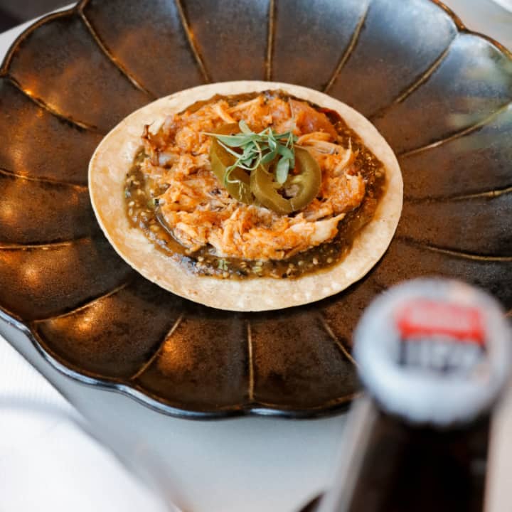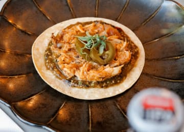 - Taco tradicional de maíz con pollo especiado y salsa de tomate de árbol Mahou 5 Estrellas