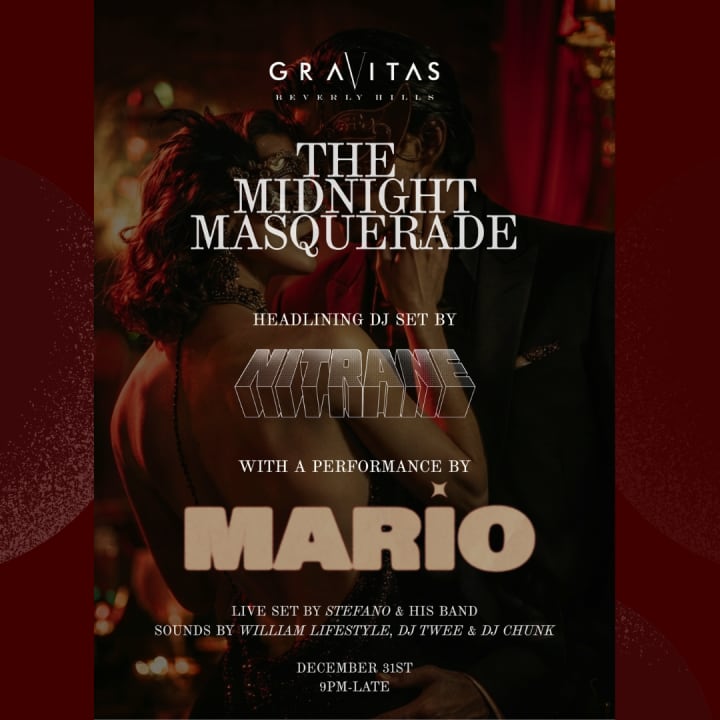 Get ready to step into a night full of mystery and fun! Join us for The Midnight Masquerade, an unforgettable evening where masks come off and the real party begins. Dress to impress, bring your best dance moves, and let's make memories under the moonlight. We're going back in time and transforming the club with a masquerade ball in mind, complete with dancers, decor, a watercolor illustrator and a tarot card reader to predict your year ahead. A live performance from our favorite vocalist Stefano & a 7-piece band - and maybe a few surprise guests - will kick off the night. He will be followed by one of LA's best DJs - DJ Nitrane - to keep the energy up throughout the night. R&B legend MARIO will join Nitrane's set for a special performance. Expect live cooking stations, dessert tables, late night passed bites, custom cocktails and a champagne bar for the evening's libations.