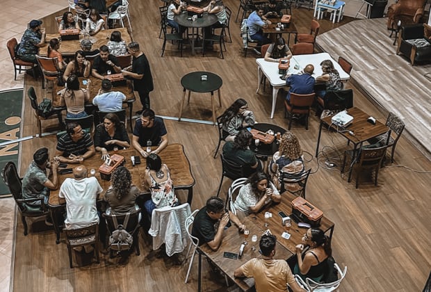- Las mesas son compartidas, los grupos de 4 personas, comparten misma mesa con otro grupo de 4 o 5 personas.