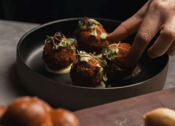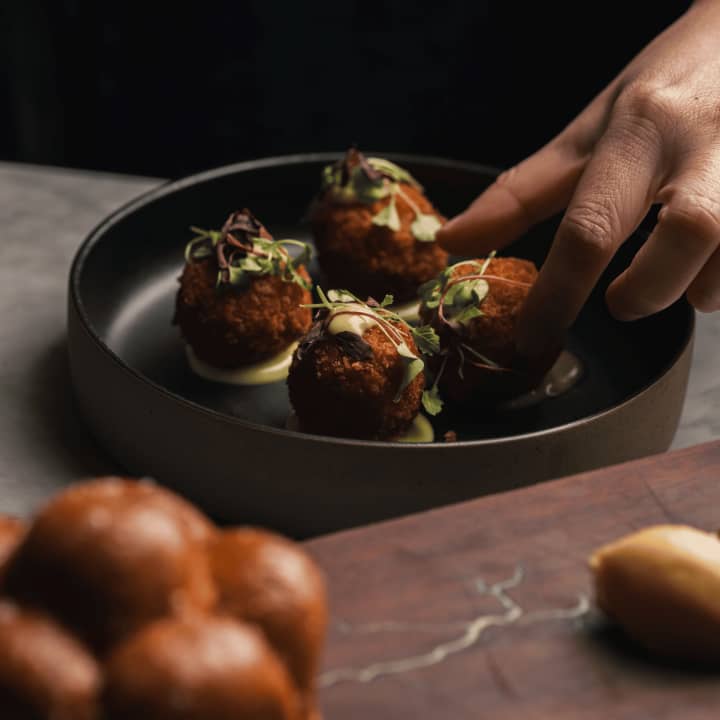 🔹 Rich Cacao paired with Blackened Cod Cheeks, Parsley Sauce, and Crispy Leeks