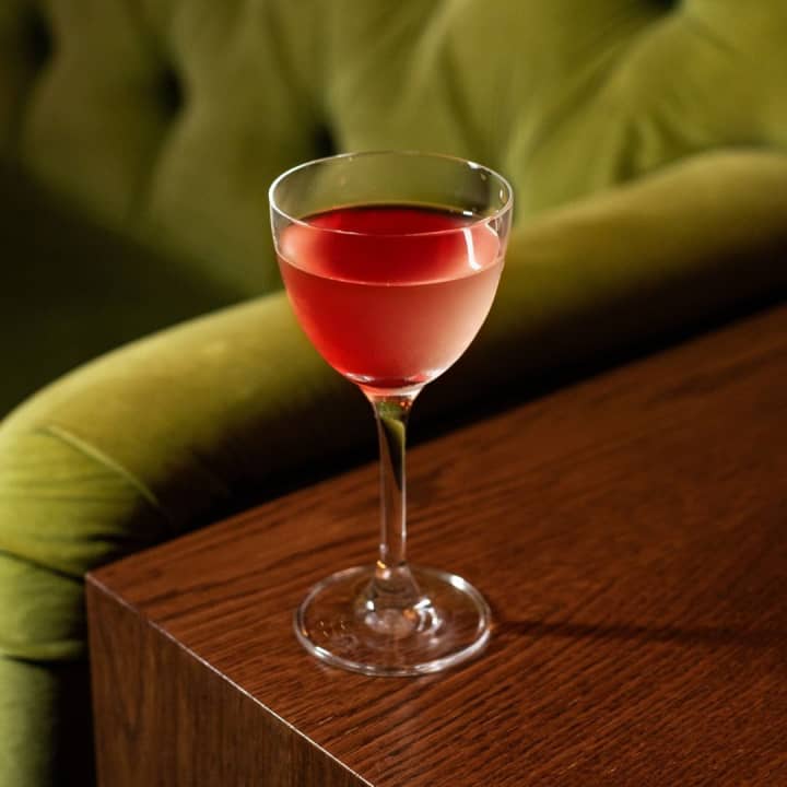 RASPBERRY SILK: Ginebra sin alcohol Seedlip Garden 108 Infusionada con Clavo, Cardamomo, Canela, y Pimienta de Jamaica, Sirope de Frambuesa especiado con Pimienta de Jamaica, Limón, Clara de Huevo IL