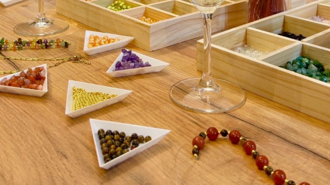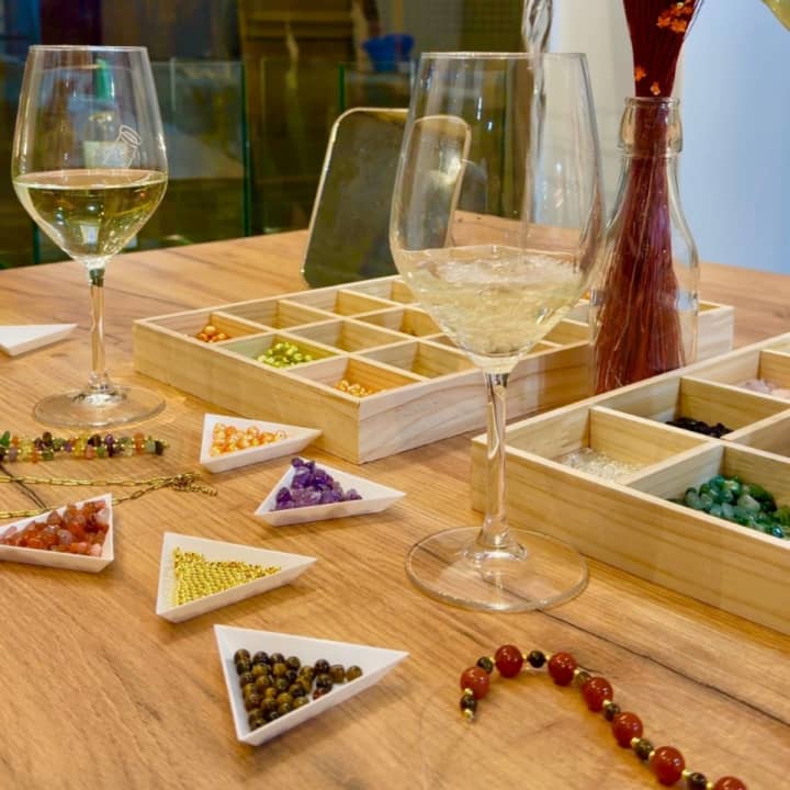 Taller de joyas con vino y bebida ilimitada en Valencia. Es una actividad de unas dos horas y media donde se enseña a realizar tres tipos de joyas. Es un plan perfecto para amigas y familias.