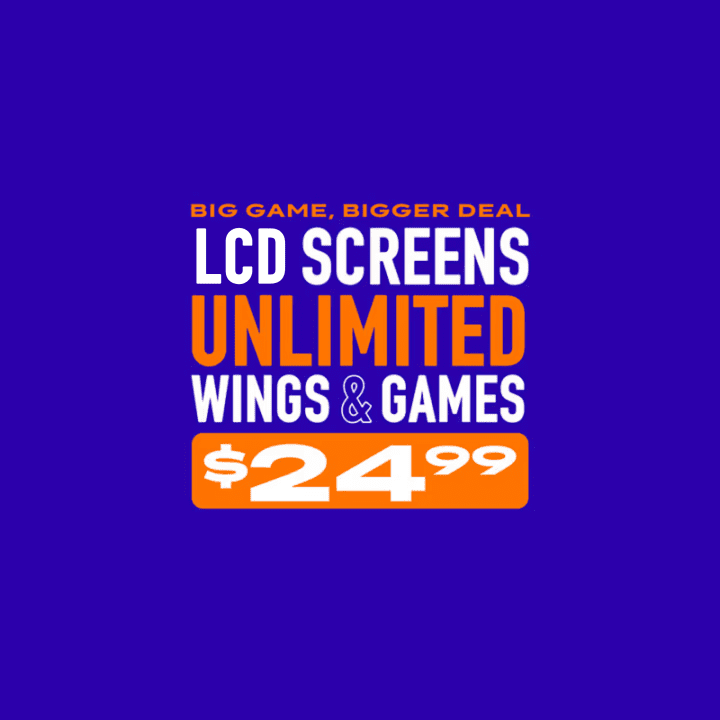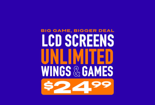 *PROMOTIONAL. Limited time only. Big Game Ticketed Experience. Offer valid 2/8/26 only. Starting at $24.99, receive premium seating access, All You Can Eat Wings until the final whistle of game, and unlimited game play all day. Tickets must be purchased in advance through FEVER up until 3:00pm pacific on 2/8/26. All You Can Eat Wings valid one per person, per seating, on premise. Get traditional and boneless wings with Classic Buffalo, Honey BBQ, or No Sauce. First individual order includes 6 traditional or boneless wings and side of ranch. Reorders include 6 traditional or boneless wings. One choice of sauce per order. Cannot mix traditional and boneless in the same order. No take home bags. Participants eligible for various in select game live moments and surprise activations, to be determined by store. Offer not available for walk-in guests. Not to be combined with other offers. Available in store only. Dine in only. Excludes human crane, VR and redemption games. Promotion may be subject to revision or rescission at any time. Prices may vary by location. Tax and gratuity not included. Subject to availability. Valid at participating locations only. Store participation may vary. Not available with any other promotion. Not available in Honolulu/Ala Moana and select stores. Other restrictions may apply. Void where prohibited. See store for details.