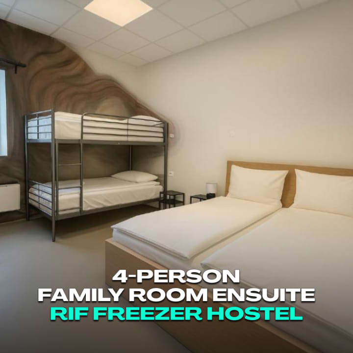 Stay immersed in Iceland’s creative coastal community with a private room for up to five guests athe Freezer—an award-winning social hostel set inside a beautifully reimagined former fish factory in the village of Rif. Guests enjoy access to fully equipped communal kitchens, inviting lounge spaces, and an intimate on-site theatre celebrated for performances, talks, and spontaneous moments of community.