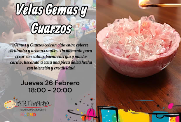 This gemstone- and quartz-style candle workshop is a creative experience designed to connect, relax and shape a unique candle made by you. During the session you will learn to transform wax, colour and details into a piece that imitates the shine of an authentic gemstone, with no prior experience necessary. The atmosphere is completed with snacks and drinks to enjoy a warm, creative and inspiring afternoon. Get your tickets for Gemstone- and quartz-style candle workshop in Madrid!