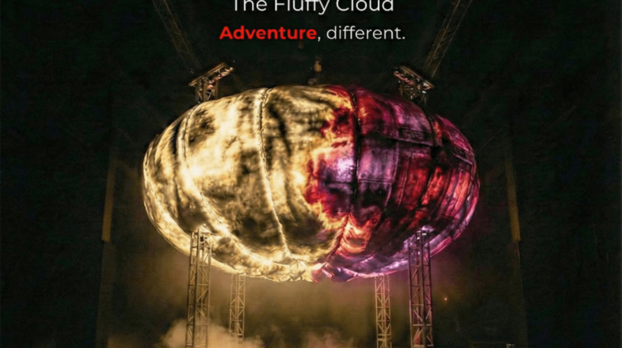A massive 15-ton UFO-like orb of light, sound and magic flies overhead — hiding over 200,000 watts of 360 patent-pending mind-melting technology within its mass. Born at Burning Man, exhibited at Art Basel, touring nationwide since 2019. The Fluffy Cloud has been called a "stupefying production" by EDM.com and "a true feat of engineering" by TPi Magazine.