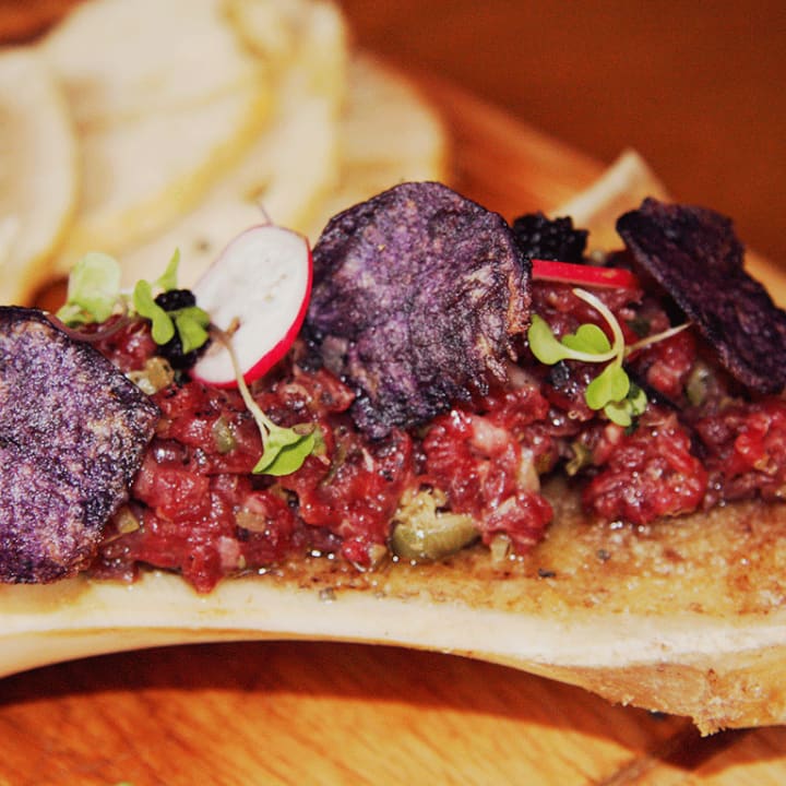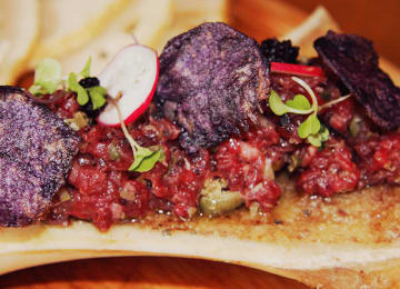 - Steak tartar templado macerado con Hendrick's Gin, servido sobre su hueso