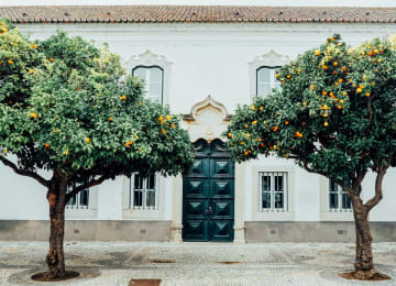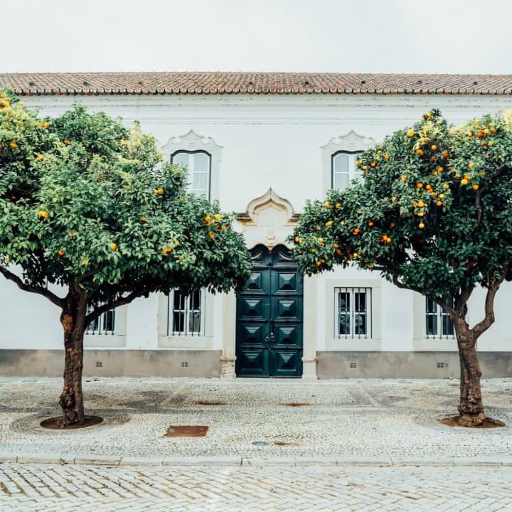 🍊 Explora o pátio da Igreja de Santa Maria, cheio de laranjeiras
