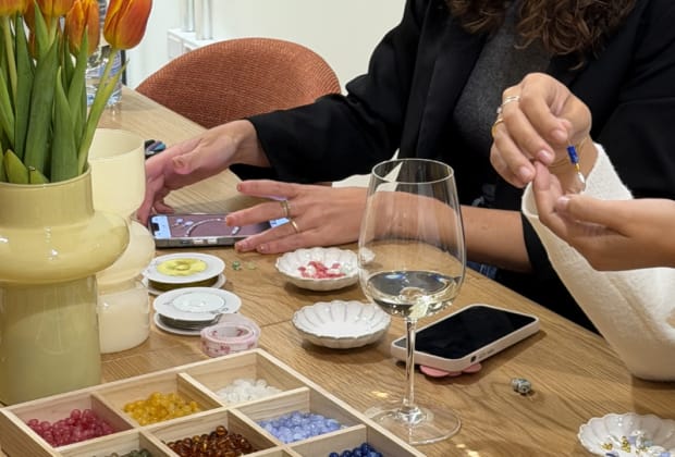 Es una experiencia creativa única: crearás tus propias joyas mientras disfrutas de vino ilimitado, rodeado de buena música, risas y un espacio increíble en el barrio de Gràcia, Barcelona.